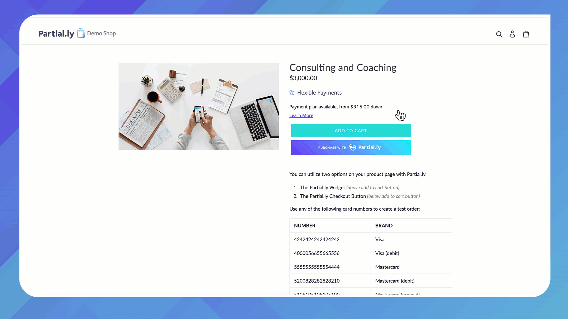The widget is a small bit of javascript code that you can place on your product pages to let customers know they can purchase with a Partial.ly payment plan. The widget will let the customer interactively see the payment plan options available to them.